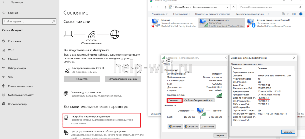 - В открывшемся окне нажимаем на кнопку “Сведения”. В новом окне IP будет прописан в строке “Шлюз по умолчанию”.