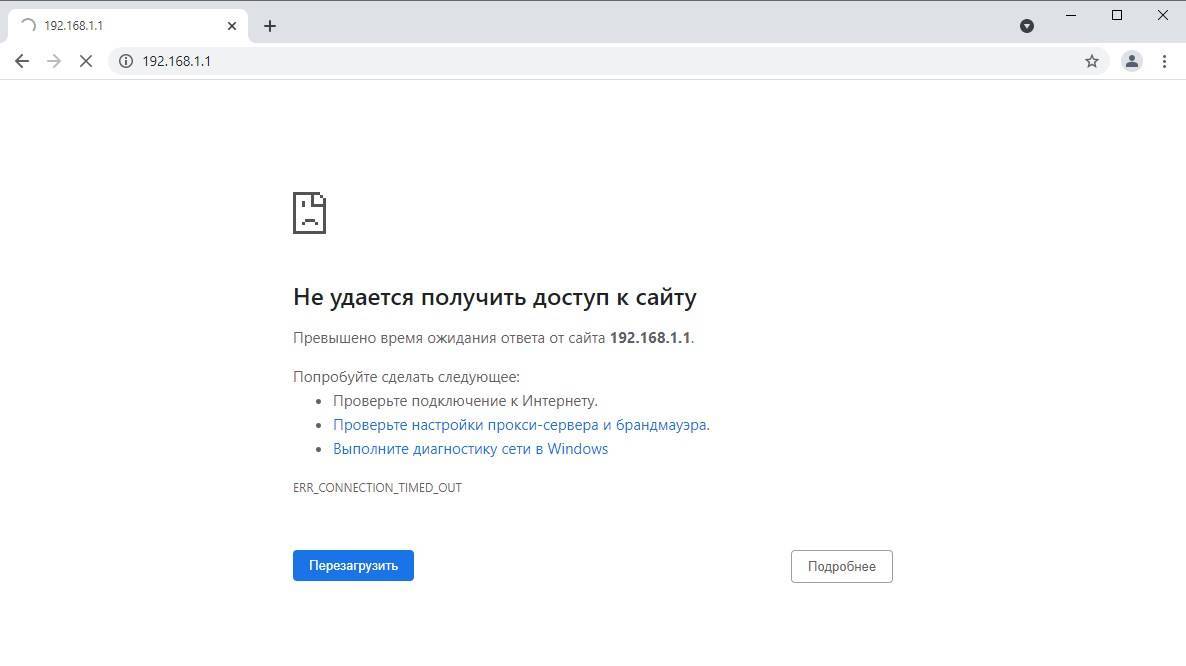 Вполне возможно, что адрес роутера является не 192.168.1.1 – именно тогда, при попытке зайти в настройки роутера через браузер, вы увидите сообщения вроде “Не удается открыть эту страницу”, “Не удается получить доступ к сайту”, “Время ожидания соединения истекло” или что-то в таком духе.