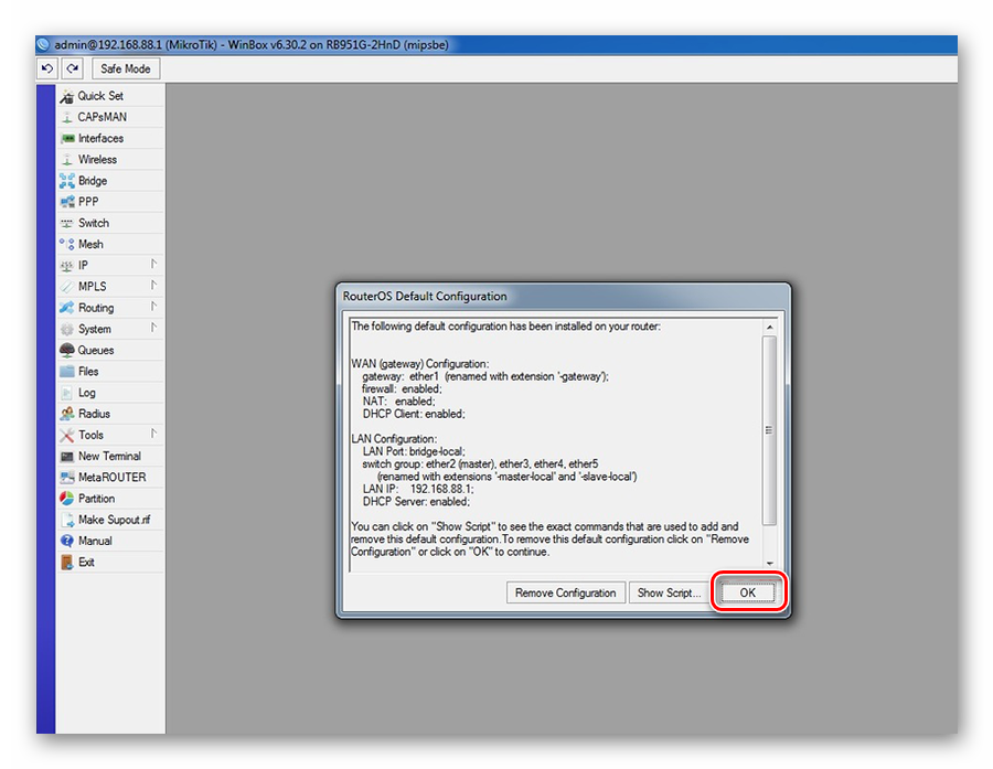 После входа в настройки роутера с помощью утилиты Winbox перед пользователем открывается окно стандартной конфигурации Mikrotik. Ему предлагается удалить ее или оставить без изменений. Если нужно произвести настройку маршрутизатора максимально быстро — необходимо оставить заводскую конфигурацию без изменений, нажав на «OK».