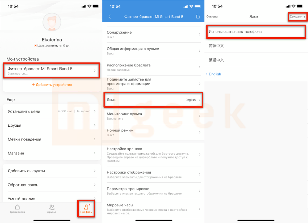Хотя ваш Mi Band 5 теперь работает на русском языке, в приложении Mi Fit, на вкладке с выбором языка, вариант выбора русского языка так и не будет доступен. Но тут можно не беспокоиться – русская локализация не слетит, даже после того как мы удалили приложение “Notify & Fitness for Mi Band”. Удачи!