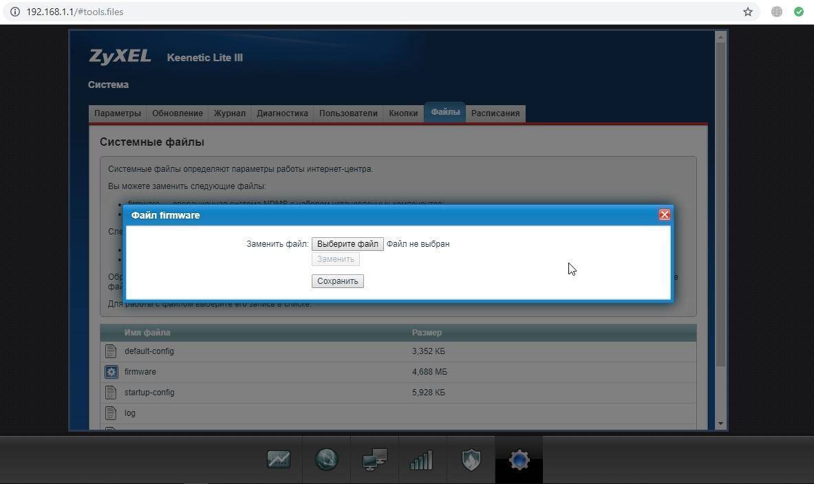 Хорошей практикой считается периодическое выполнение резервного копирования системных файлов прошивки, стартовой конфигурации, а также и их обновление с официального сайта производителя. В ZyXEL Keenetic резервное копирование можно выполнить через меню «Система», закладку «Файлы».