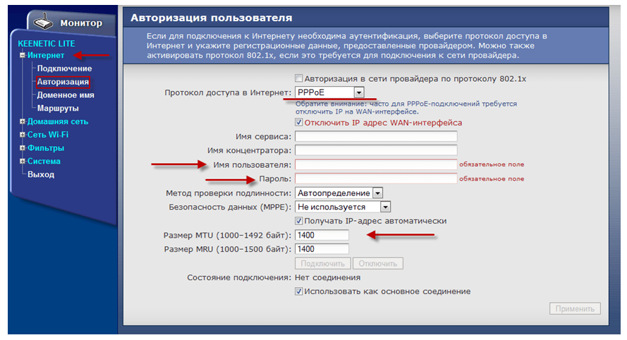 В интерфейсе роутера необходимо выбрать вкладку слева «Интернет», в открывшемся списке выбираем «Авторизация»,