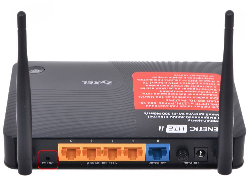 Любой роутер ZyXEL оснащен специальной кнопкой сброса «RESET», расположенной в задней части возле портов LAN. Для предотвращения случайных нажатий она немного утоплена вглубь корпуса. Ищите небольшое отверстие с надписью «RESET» или «СБРОС» (если устройство русифицировано). Удерживая кнопку в течении 5-10 секунд (как только загорится индикатор питания, отпускайте), осуществите сброс до заводских настроек. Чтобы нажать кнопку, используйте какой-либо тонкий предмет, например, скрепку.
