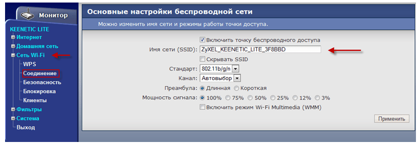 Выставляем параметры следующим образом:Поле «SSID»: вводим название беспроводной сети. Значение в этом поле можно не менять.Применить».