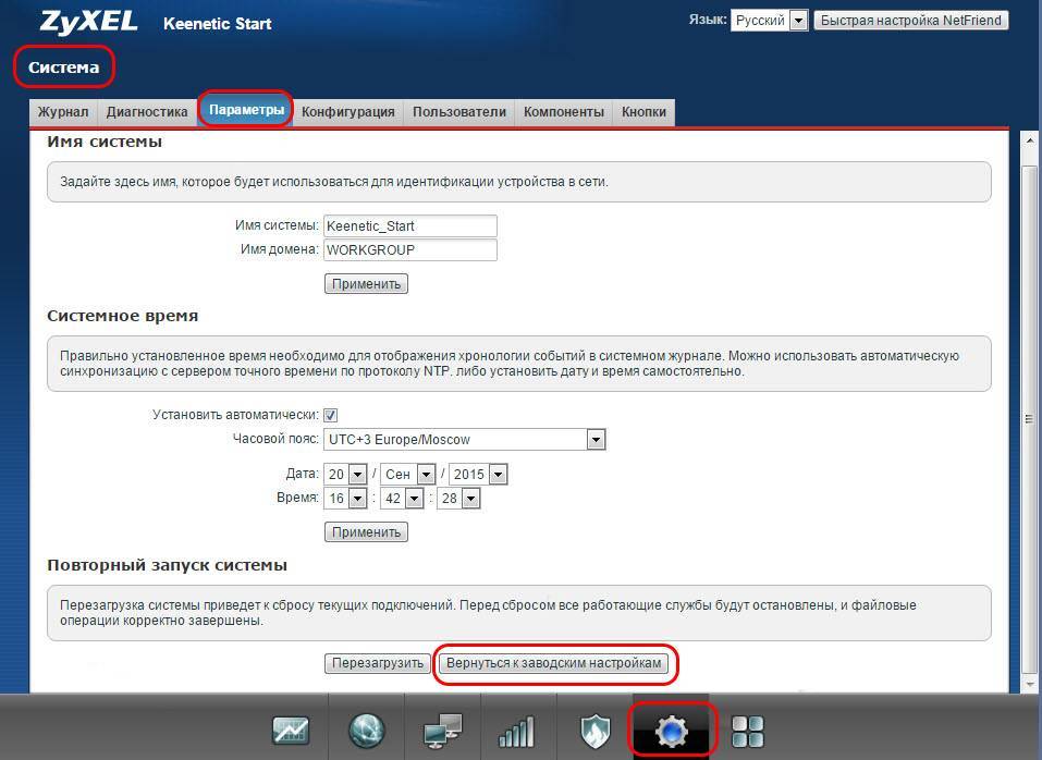 Сброс настроек через web-интерфейс выполняется следующим образом (на примере ZyXEL Keenetic Lite III):