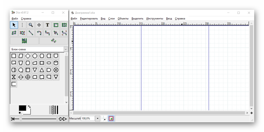 На втором месте в данном списке вполне справедливо располагается Dia, в которой сосредоточены все необходимые современному пользователю функции для построения схем. К тому же, редактор распространяется на бесплатной основе, что упрощает его использование в образовательных целях.