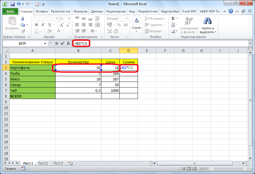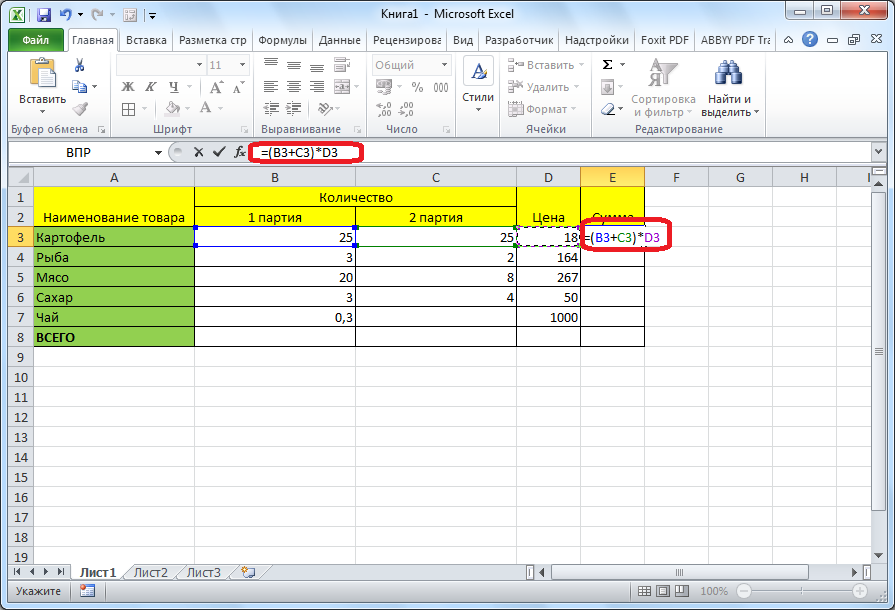 Усложним задачу, разделив количество товара в таблице на две партии. Теперь, чтобы узнать общую стоимость, следует сперва сложить количество обеих партий товара и полученный результат умножить на цену. В арифметике подобные расчеты выполнятся с использованием скобок, иначе первым действием будет выполнено умножение, что приведет к неправильному подсчету. Воспользуемся ими и для решения поставленной задачи в Excel.