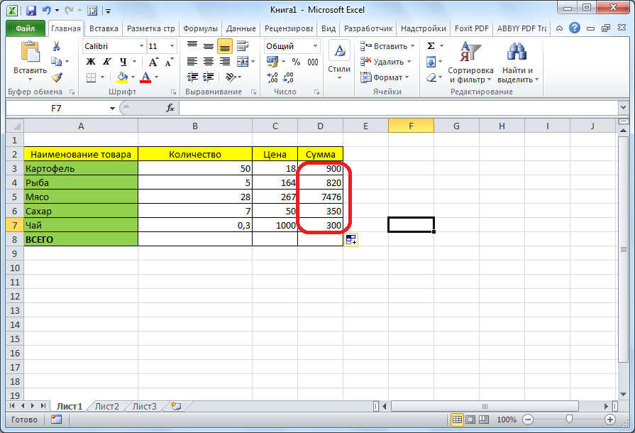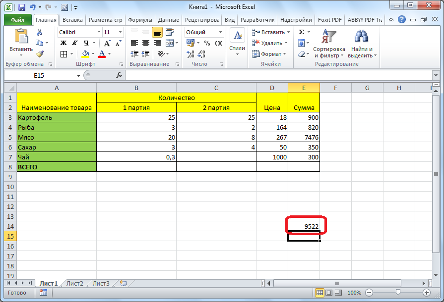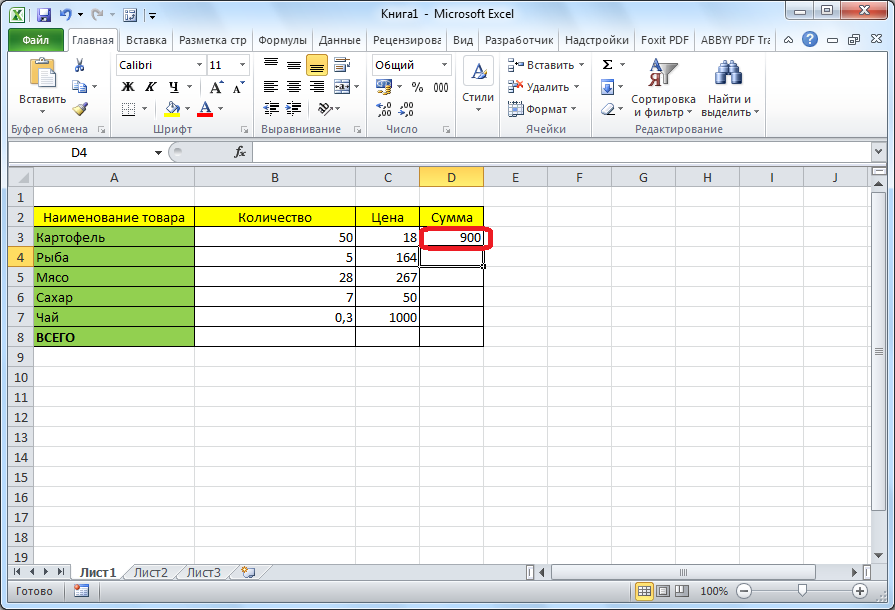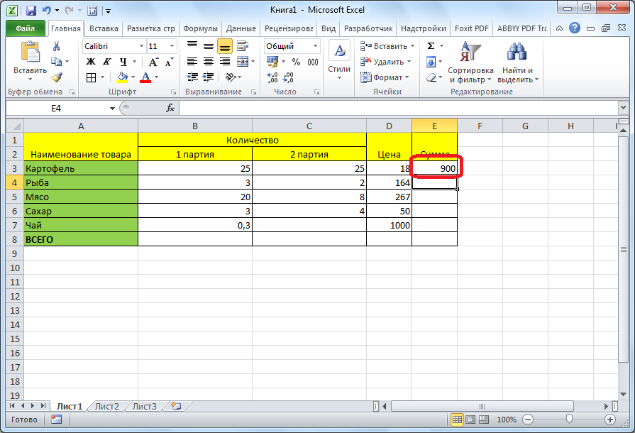 В следующем примере мы просуммируем общую стоимость всех проданных фруктов. Для этого воспользуемся следующей формулой: