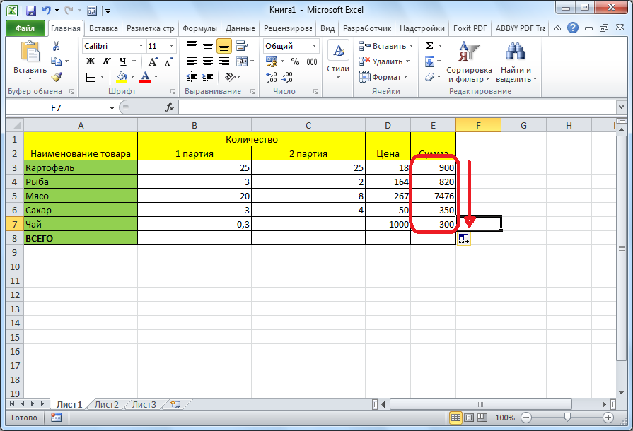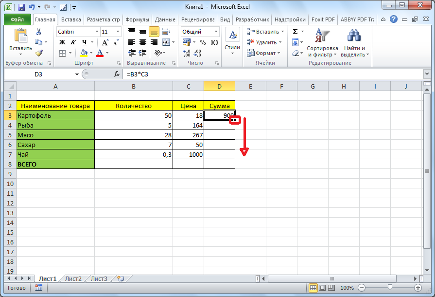 Чтобы не вводить эту формулу каждый раз для вычисления общей стоимости каждого наименования товара, наведите курсор на правый нижний угол ячейки с результатом и потяните вниз на всю область строк, в которых расположено наименование товара.