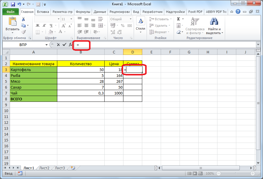 - Выбираем ячейку, где должна будет отображаться сумма, и ставим там =. Далее выделяем ячейку с количеством товара — ссылка на нее сразу же появляется после знака равенства. После координат ячейки нужно вставить арифметический знак. В нашем случае это будет знак умножения — *. Теперь кликаем по ячейке, где размещаются данные с ценой единицы товара. Арифметическая формула готова.