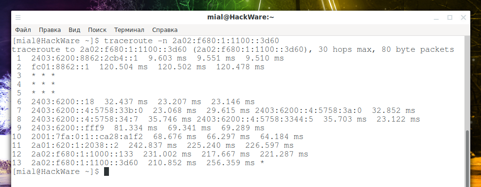 Для трассировки укажите IPv6 адрес удалённого хоста: