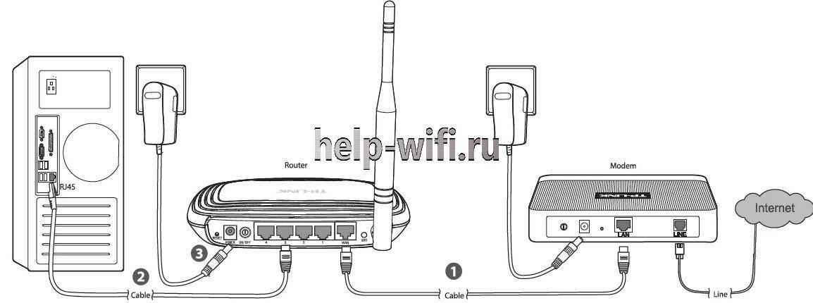 Роутер имеет входной разъём (коннектор) WAN для подключения к нему кабеля провайдера интернет и несколько разъёмов LAN, с которыми состыковываются кабели стационарных устройств сети (компьютеров). Используют нужное количество выходов. Эту часть устройства можно представить как роутер без wi-fi.