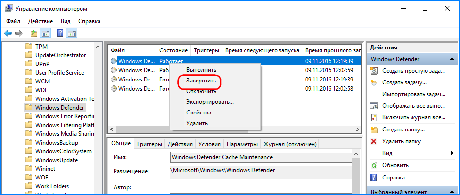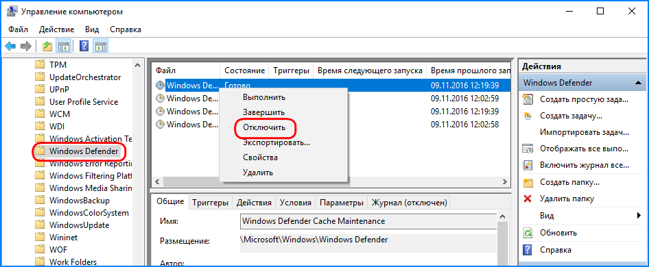 Первым делом мы рассмотрели отключение запуска задач Защитника Виндовс.
