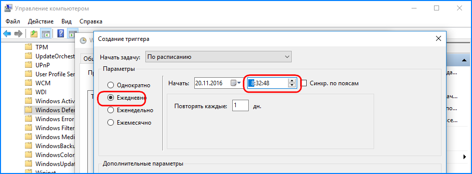7Задачи защитника можно изменить по времени запуска, во вкладке «Триггеры» устанавливаем параметры работы приложения (дату, время, частотность запуска).