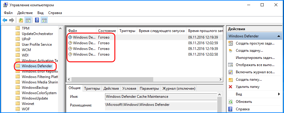 Внутри последнего подраздела отыщите каталог Windows Defender и выделите его мышкой, при этом в средней части оснастки вы увидите четыре задания по антивирусному сканированию системы.