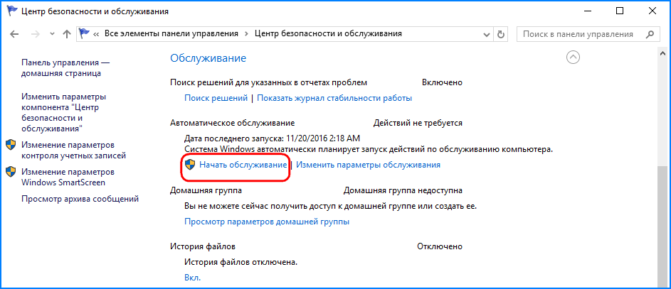 Альтернативой описанным выше способам может послужить запуск автоматического обслуживания системы в ручном режиме. Для этого необходимо зайти в классическую панель управления, выбрать там апплет «Центр безопасности и обслуживания» и нажать ссылку «Начать обслуживание».