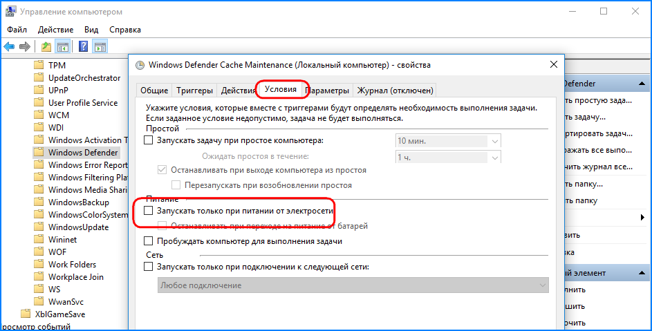 А для портативных устройств также снять галочку с пункта «Запускать только при питании от электросети» на вкладке «Условия».