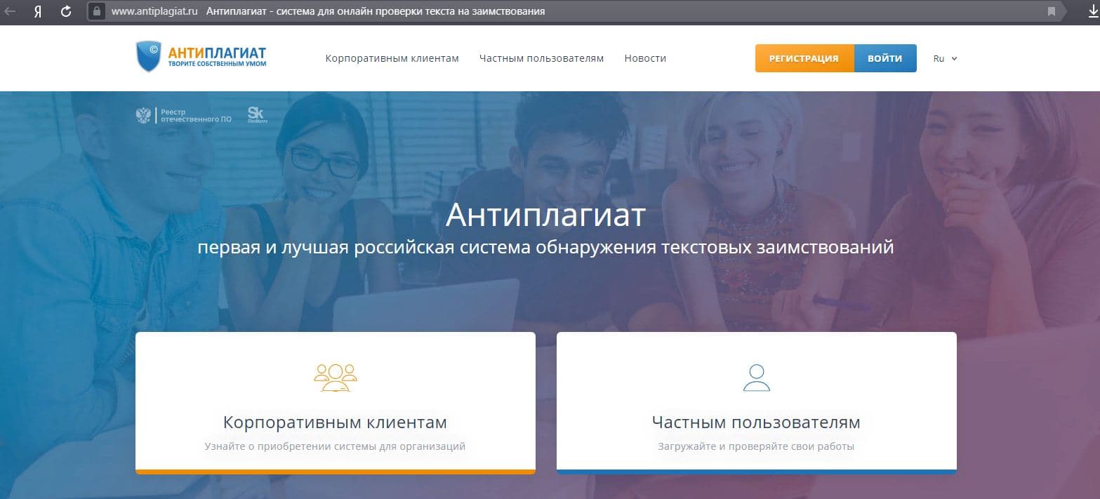 Открывая главную страницу официального сайта можно увидеть, что программа антиплагиат доступна как для корпоративных клиентов, так и для частных пользователей.