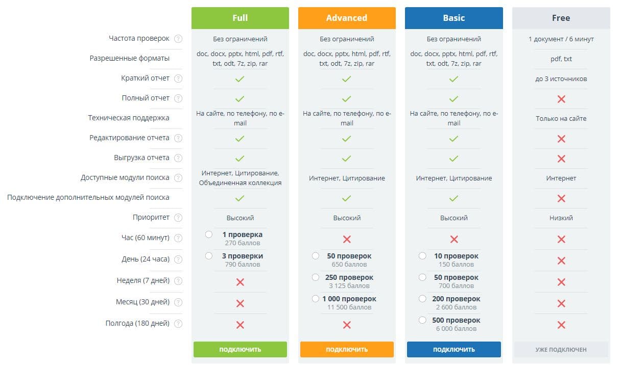 Заметим, что модуль поиска «Объединенная коллекция», который также присутствует в Антиплагиат.ВУЗ доступна только в тарифе «Full», одна проверка которым обойдется в 270 рублей.