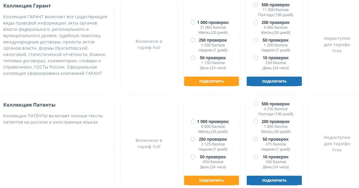 Помимо представленных подписок на сайте Антиплагиат.ру возможно подключить пакет дополнительных услуг. Всего на сайте присутствует 11 коллекций, которые также подключаются на ограниченное время.