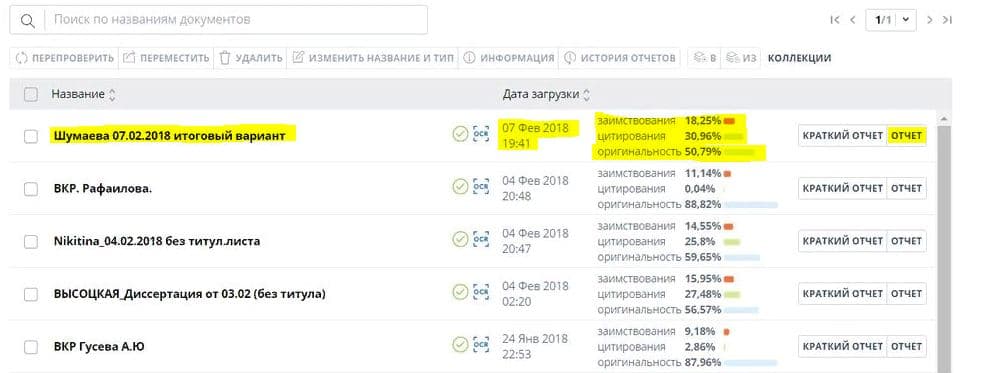 Просканированный файл также как и в бесплатной версии добавляется к проверенным ранее работам с пометкой даты, времени, процента оригинальности, заимствований и цитирований. В любой из платных версий антиплагиата доступен полный отчет о проверке, который включает расширенные данные об использованных источниках.