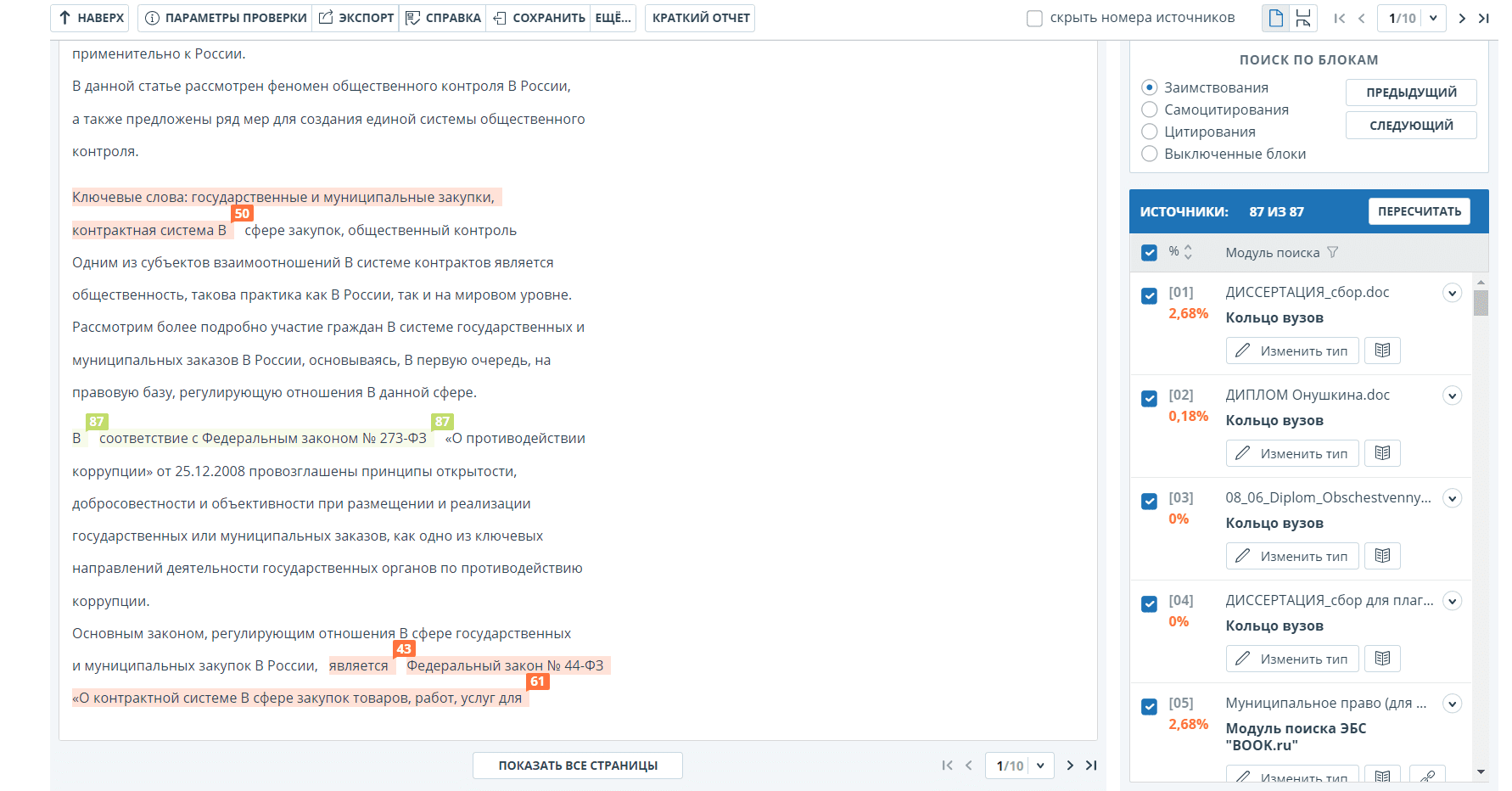 Что еще важно, так это то, что в антиплагиат ВУЗ можно сформировать и скачать полную версию отчета о проверке. В отчете будут видны все неуникальные блоки