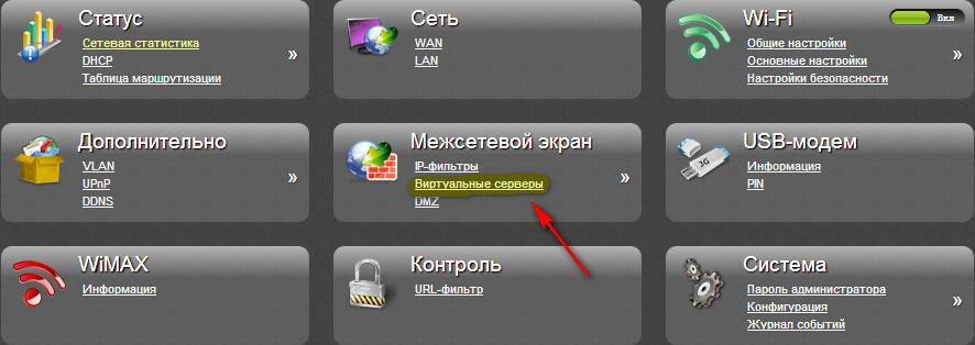 Теперь буду открывать порт видеокамеры для обеспечения правильной маршрутизации запросов к ней. Иду в меню, выбираю виртуальные серверы.