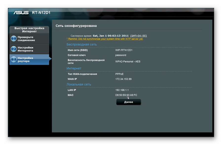 Нажатие на кнопку «Далее» вернет пользователя на главную страницу веб-интерфейса маршрутизатора, где производится изменение дополнительных параметров.