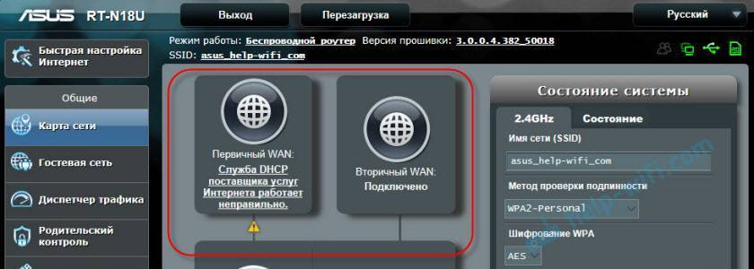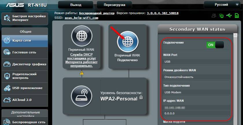 Как видите, подключение “Первичный WAN” не работает, и роутер автоматически начал использовать “Вторичный WAN”.