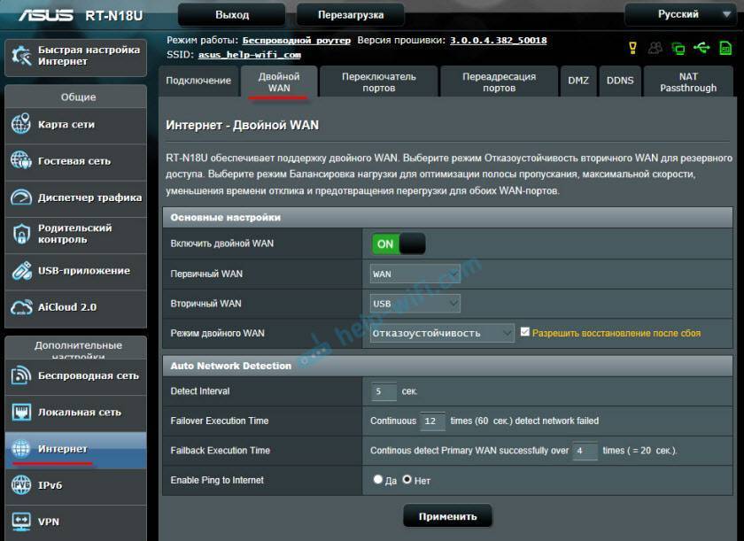 - Detect Interval – скорее всего здесь задается интервал времени, после которого наш ASUS будет переходить на резервное подключение, после разрыва главного подключения.