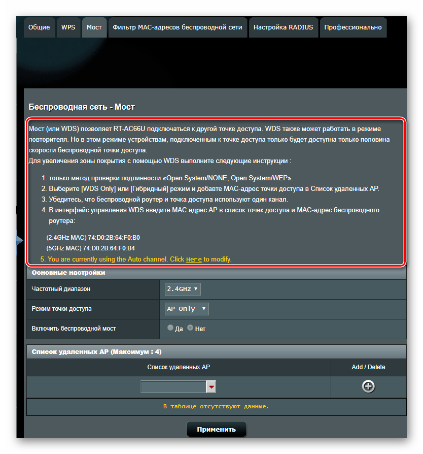 Если необходимо изменить другие параметры беспроводной сети — во вкладках содержится их описание и подробная инструкция для пользователя, не требующая дополнительных пояснений. Например, на вкладке «Мост» имеется пошаговая инструкция для настройки маршрутизатора в режиме повторителя: