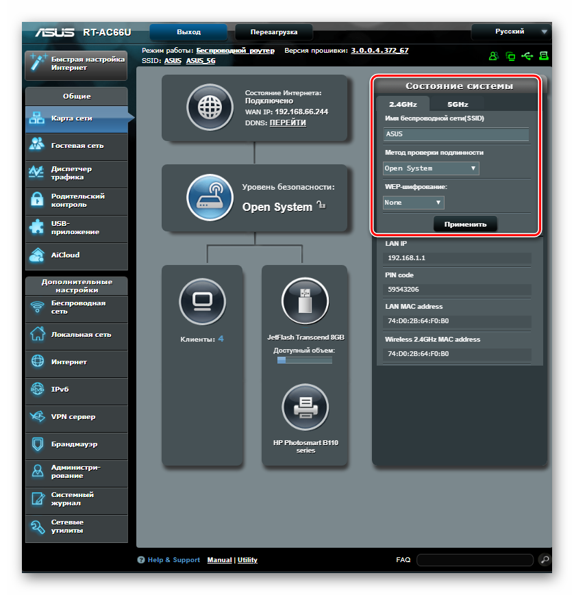 Настраивать Wi-Fi соединение на роутерах АСУС очень просто. Все значения задаются прямо на главной странице веб-интерфейса. Там в правой части окна имеется раздел «Состояние системы», в котором отображены основные параметры беспроводной и проводной сети. Изменяются они прямо там.
