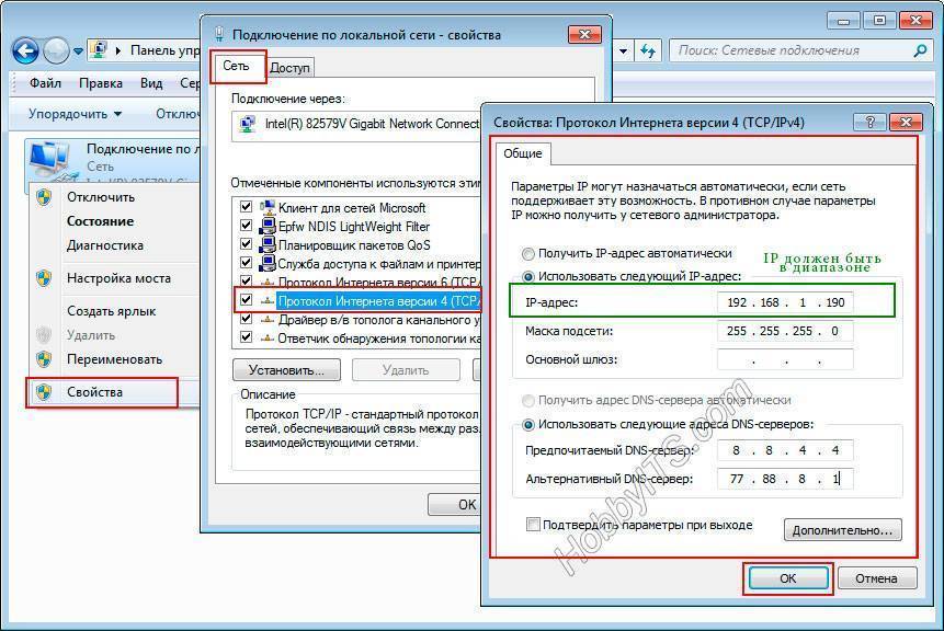 В новом окне на вкладке «Сеть» выделите «Протокол Интернета версии» и нажмите кнопку «Свойства». Активируйте и заполните пункт «Использовать следующий IP-адрес». Такая жесткая привязка IP может вызвать проблемы в других сетях, но вы всегда вольны вернуть все в автоматический режим.