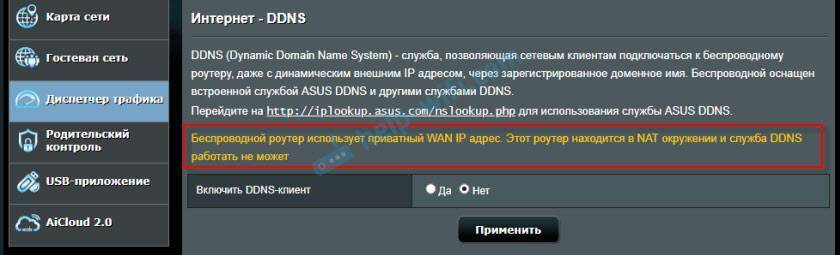 Некоторые маршрутизаторы могут сами определять, какой IP-адрес выдает провайдер. Приватный (серый) , или публичный (белый) . Так, например, на роутерах ASUS, если адрес серый, то в разделе с настройками DDNS отображается следующее предупреждение: «Беспроводной роутер использует приватный WAN IP адрес. Этот роутер находится в NAT окружении и служба DDNS работать не может».