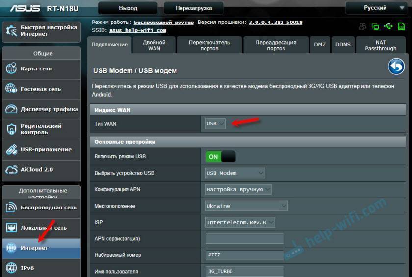 Сохраняем настройки. В меню “Тип WAN” выбираем второе подключение “USB” или “Ethernet LAN” и задаем необходимые параметры для подключения к интернету через этот порт. У меня это “USB”, и я настроил подключение к своему оператору через модем. О настройке 3G/4G модема на роутере ASUS я писал здесь.