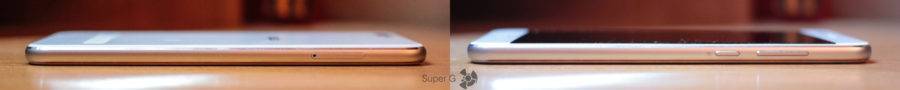 На левом торце располагается микрофон и лоток установки пары SIМ-карт формата nanоSIM, одну из которых можно заменить на носитель формата micrоSD. На правом торце установлены клавиши блокировки и управления уровнем громкости.