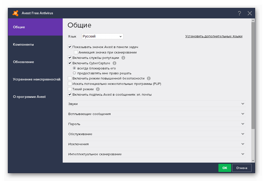 Вкладка со звуками отвечает за персонализацию «рингтонов», издаваемых Авастом. Но стоит помнить, что игры со «светомузыкой» напрямую влияют на производительность системы.