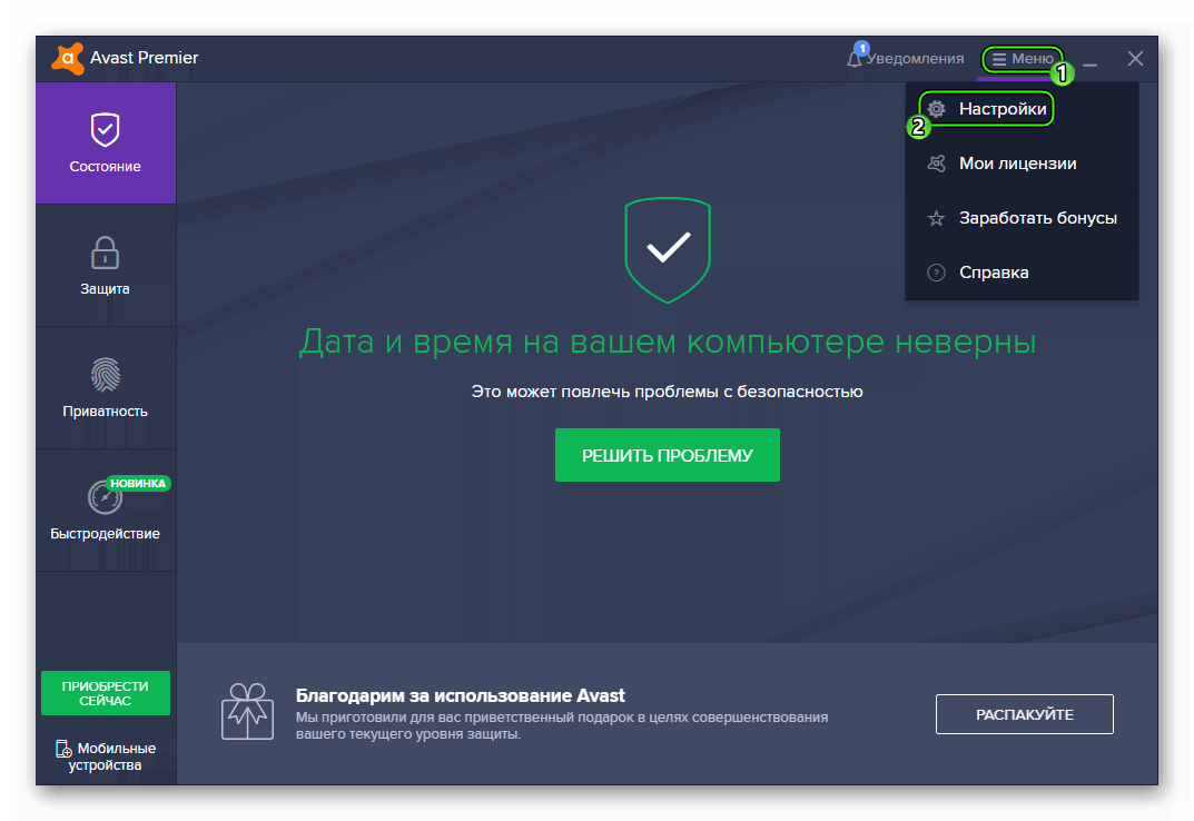 Переходим к непосредственному рассмотрению проблематики. Разработчики Avast дали клиентам широкое поле для пользовательской коррекции настроек системы. Долг повествователя требует рассмотрения всех возможностей. Для удобства восприятия разобьем дальнейшее повествование на несколько логических блоков. А чтобы попасть на страницу параметров, кликните на «Меню», а потом на первый пункт в появившемся списке.
