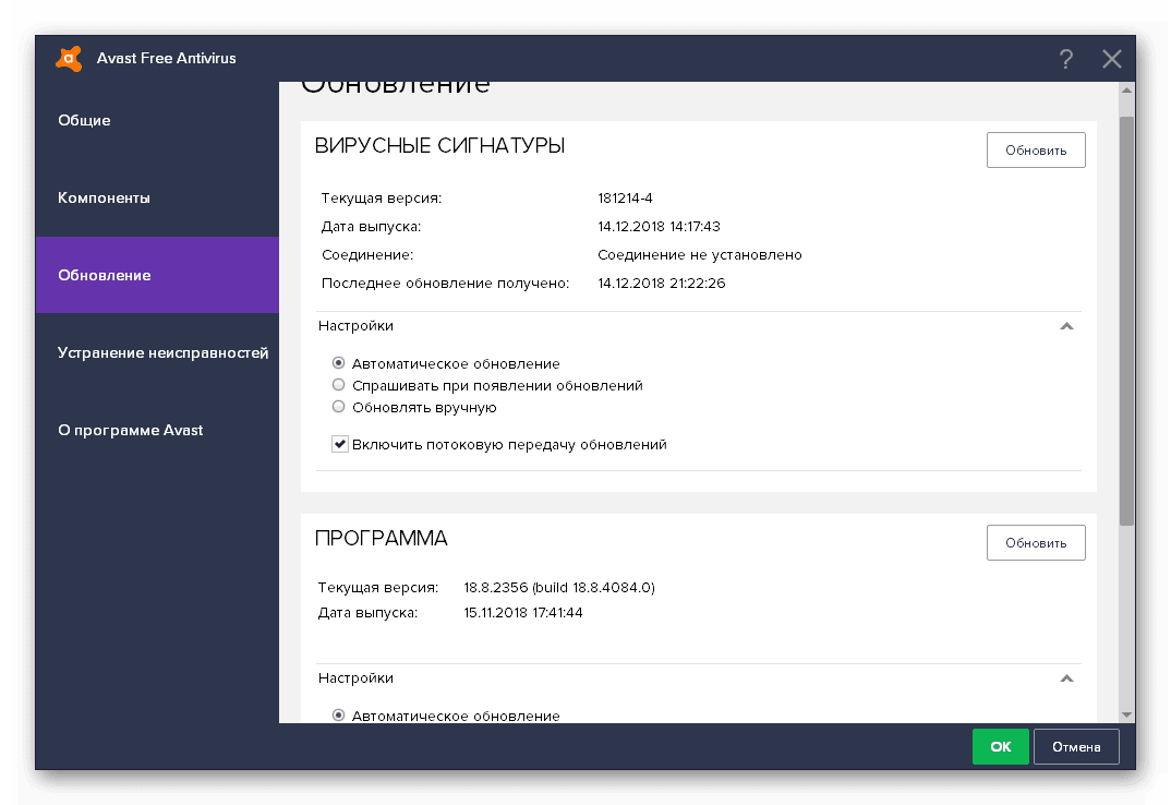 С данным разделом все более чем ясно. Крайне рекомендуется использовать исключительно последнюю версию антивируса, поскольку она является наиболее безопасной и совершенной. То же самое касается и вирусной базы. Для обоих компонентов можно активировать автообновление.