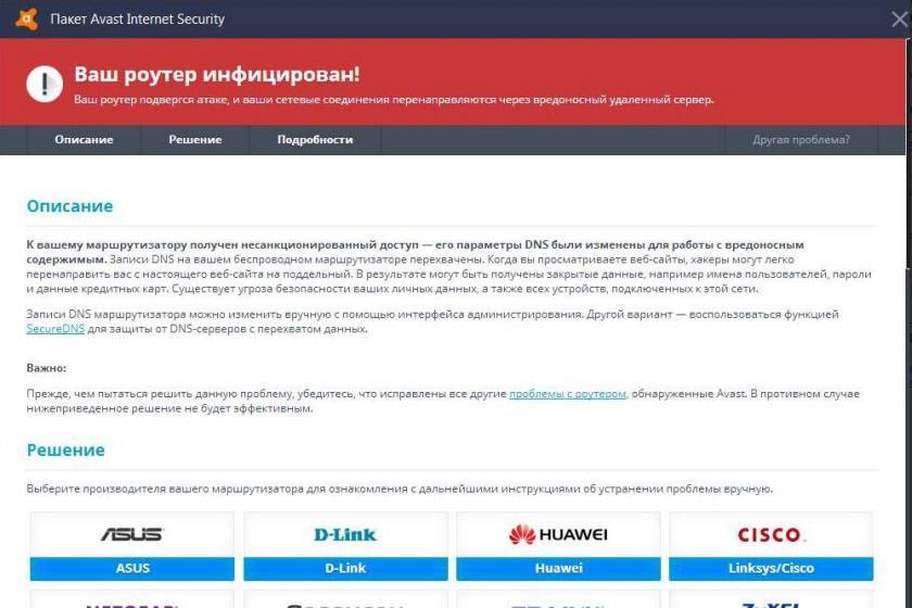 , и соединения перенаправляются на вредоносный сервер. Антивирус Avast объясняет это тем, что ваш роутер был взломан, и в нем были изменены DNS-адреса на вредоносные. И там же предоставлены инструкции по решению этой проблемы для разных роутеров: ASUS, TP-Link, ZyXEL, D-Link, Huawei, Linksys/Cisco, NETGEAR, Sagem/Sagemco.