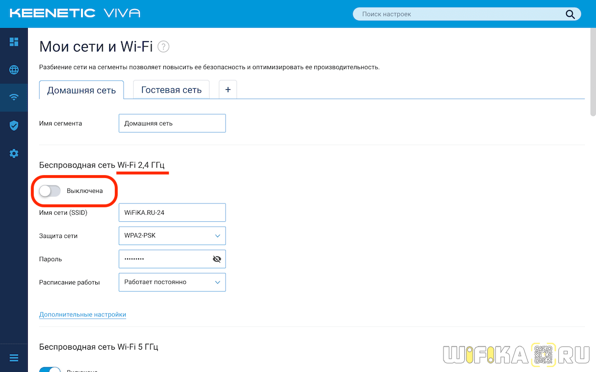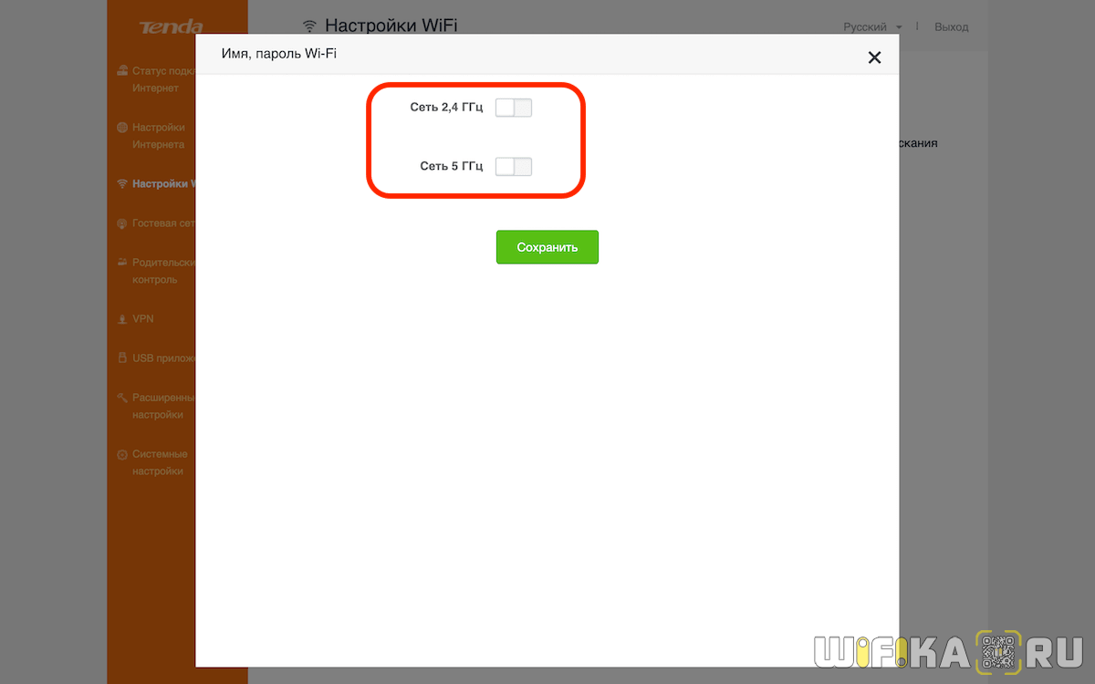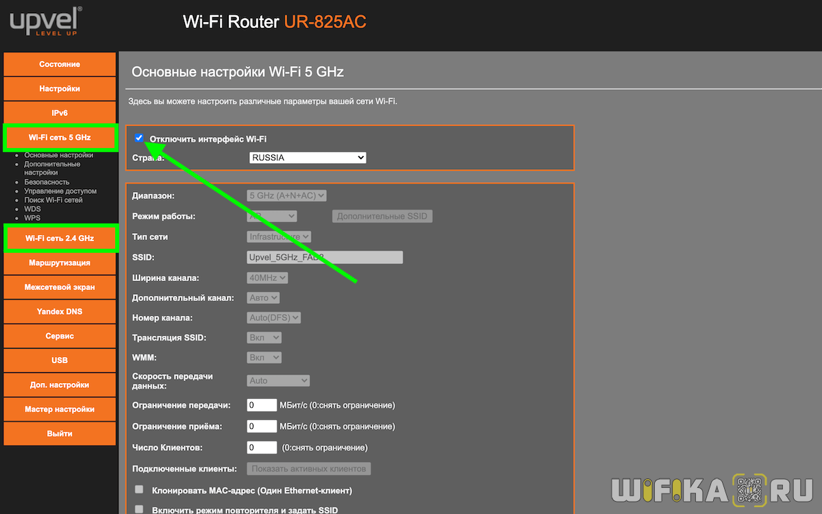 Здесь для каждого диапазона свой пункт в навигации. Заходим в каждый из них и в отличие от других роутеров наоборот, ставим галочку напротив «Отключить интерфейс Wi-Fi»
