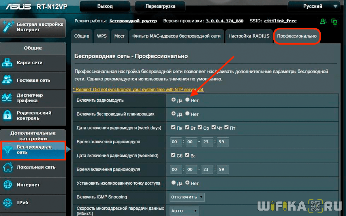 Меню «Беспроводная сеть», вкладка «Профессионально». Ставим «Нет» на пункте «Включить радиомодуль»