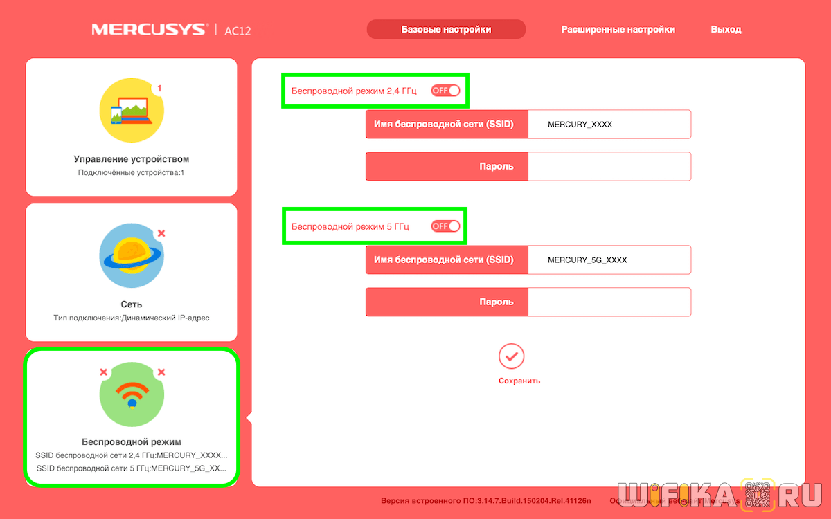 В основном блоке «Беспроводной режим» выключаем сети в обоих частотных диапазонах (2.4 и 5 ГГц)