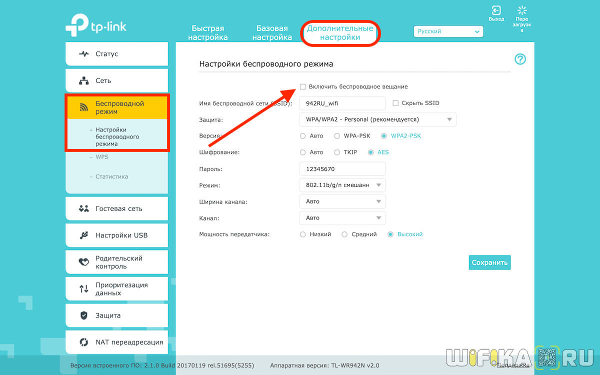Заходим в «Настройки беспроводного режима» и снимаем галочку с «Включить беспроводное вещание»