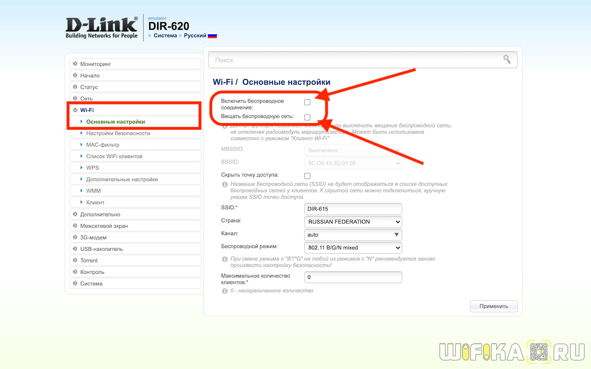 В меню «WiFi» открываем «Основные настройки» и снимаем флажки с двух пунктов: