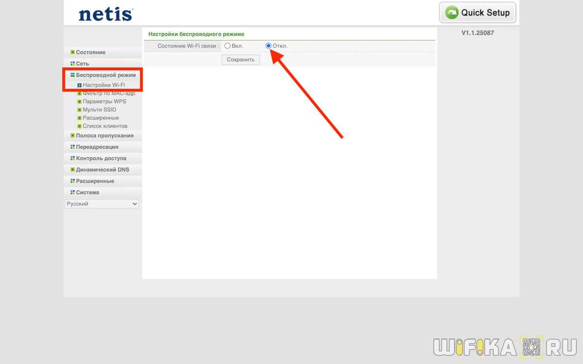 В рубрике «Беспроводной режим» ставим «Состояние Wi-Fi связи» в «Откл.»