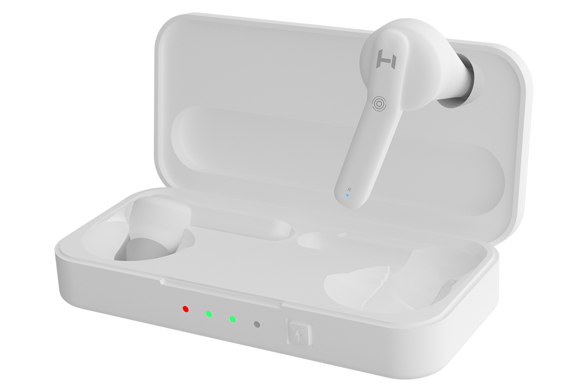 Для того, чтобы посмотреть оставшийся заряд, необходимо нажать на кнопку под крышкой. Внутри размещены сами беспроводные наушники. Они тоже глянцевые с нанесенным на верхнюю часть логотипом Harper, под которым находится сенсорная кнопка управления.