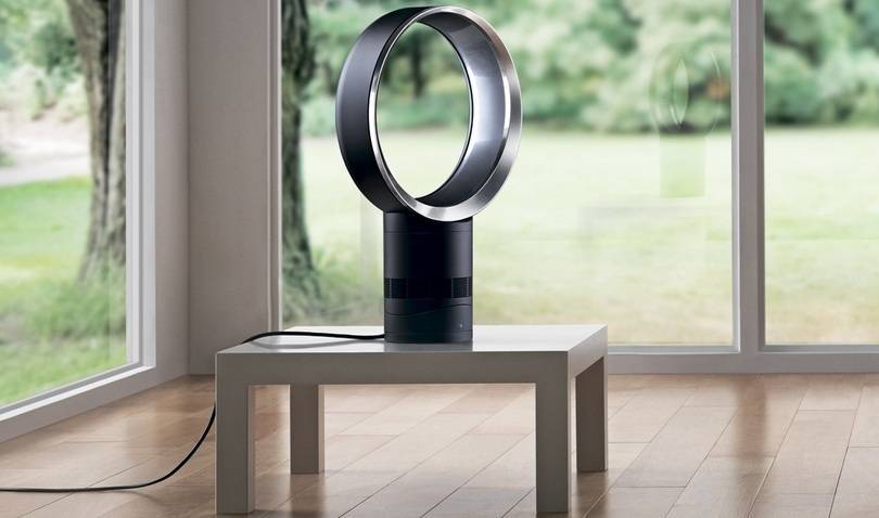 Безлопастный вентилятор по своей форме представляет аэродинамической кольцо, которое расположено на небольшой подставке.