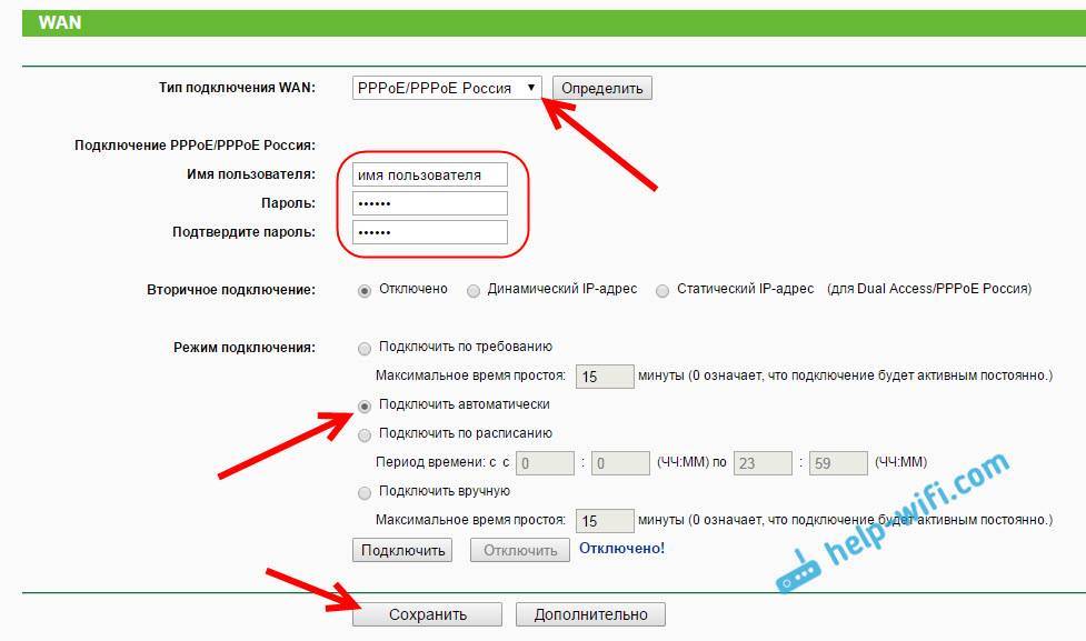 Достаточно выбрать PPPoE, указать имя пользователя и пароль, выставить обязательно автоматическое подключение, и сохранить настройки.