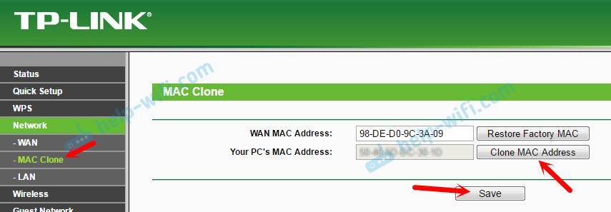 Некоторые провайдеры делают привязку интернета к MAC-адресу. И если у вас интернет был привязан к компьютеру, к которому сейчас подключен роутер, то можно попробовать клонировать MAC с компьютера. Это можно сделать на вкладке “Network” (Сеть) – “MAC Clone”. Нажав на кнопку “Clone MAC Address”.